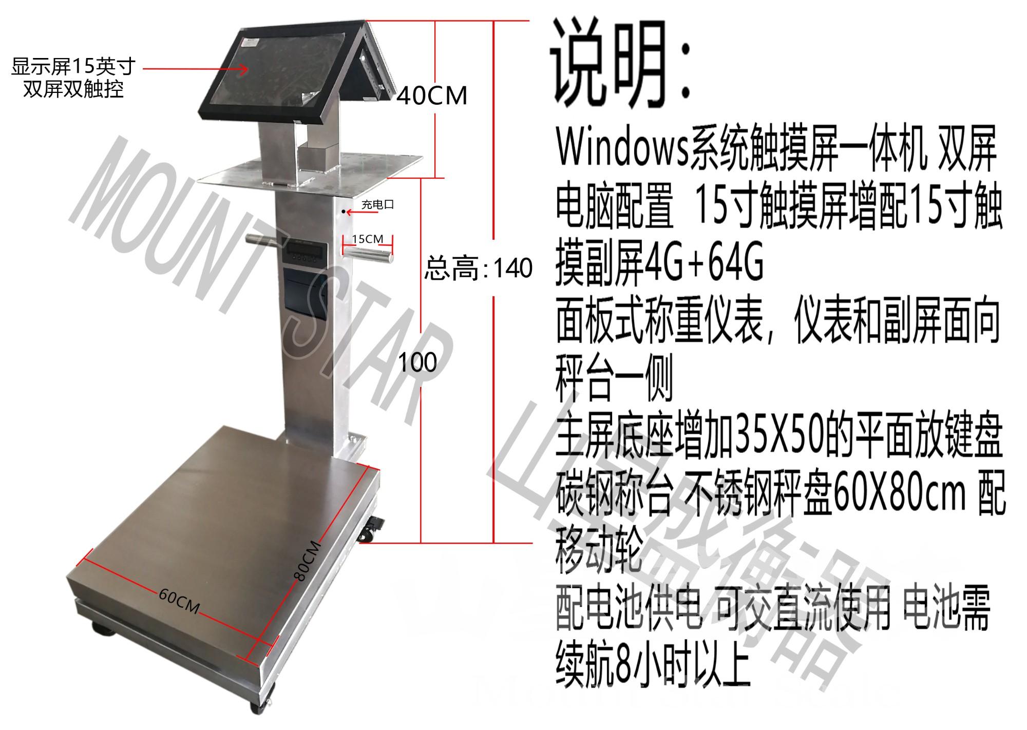 追溯源安卓Android微軟WIN7操作系統(tǒng)標(biāo)簽打印APK電子稱exe軟件多功能一體電子秤是在電子秤的基礎(chǔ)上加裝多種選配件組裝成,由15寸雙觸膜顯示器+打印機(jī)+充存電+攝像頭+掃碼裝置等