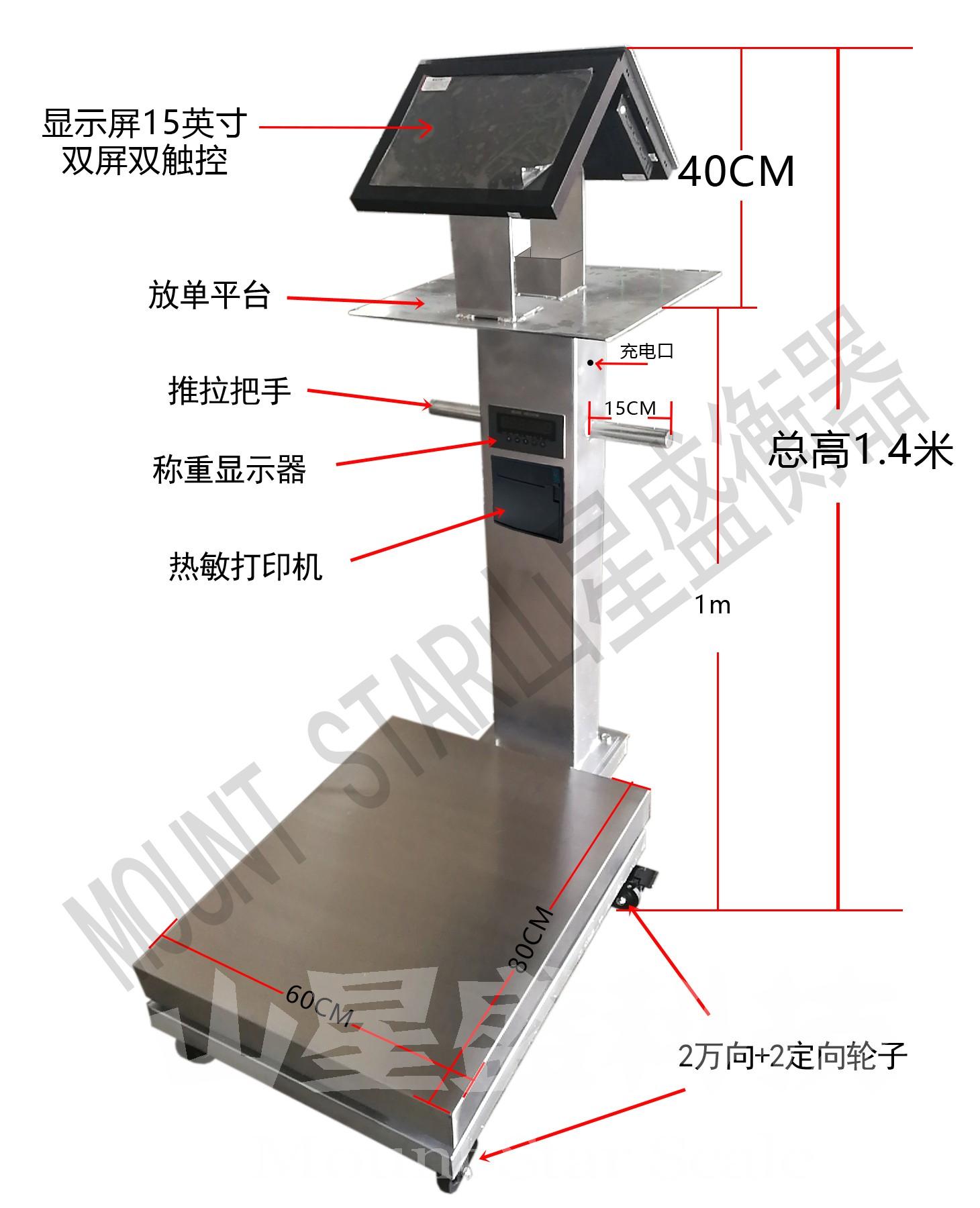 多功能一體電子秤是在電子秤的基礎(chǔ)上加裝多種選配件組裝成,由15寸雙觸膜顯示器+打印機(jī)+充存電+攝像頭+掃碼裝置等